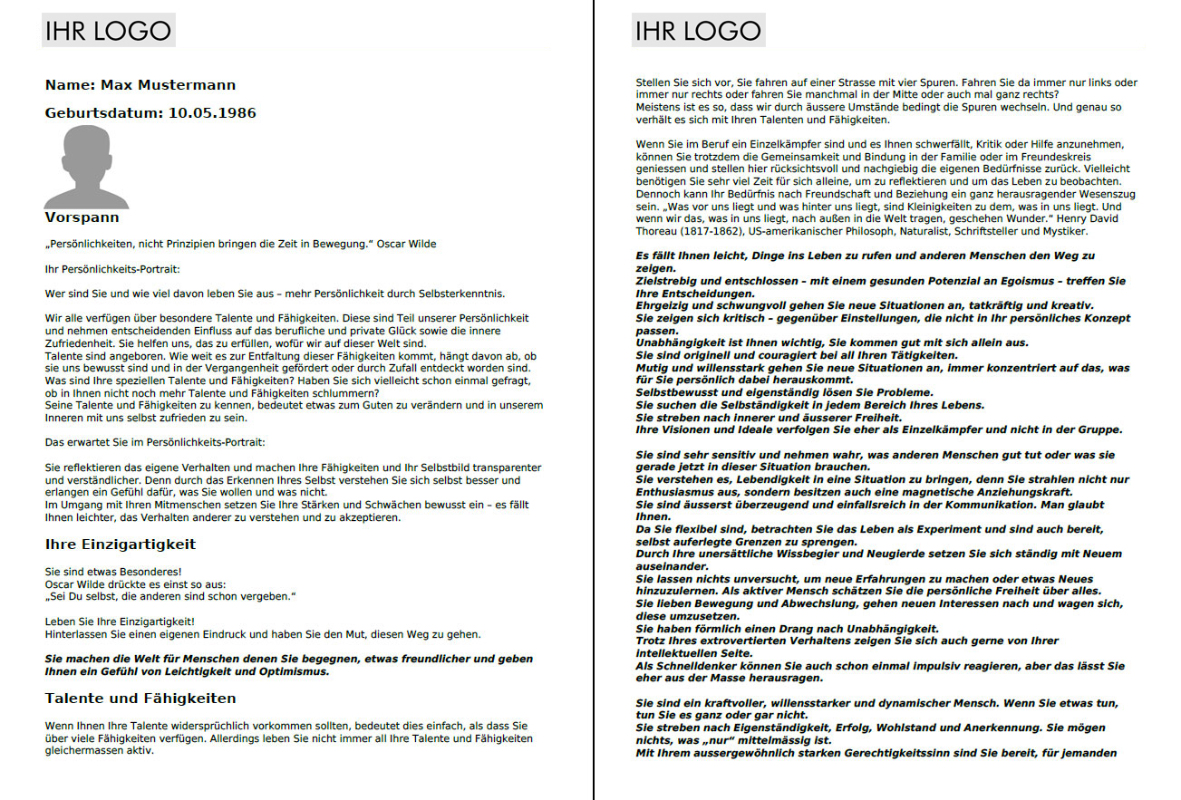 Sie erhalten die Auswertung in einem 8 bis 10-seitigen Dokument als pdf-Datei zugesandt. Zusätzlich erhalten Sie Zugang zu einem geschützten Mitgliederbereich, wo alle Analysen vorhanden sind und dauerhaft gespeichert werden. Sie haben also lebenslang Zugriff auf alle Soft Skill Analysen.
